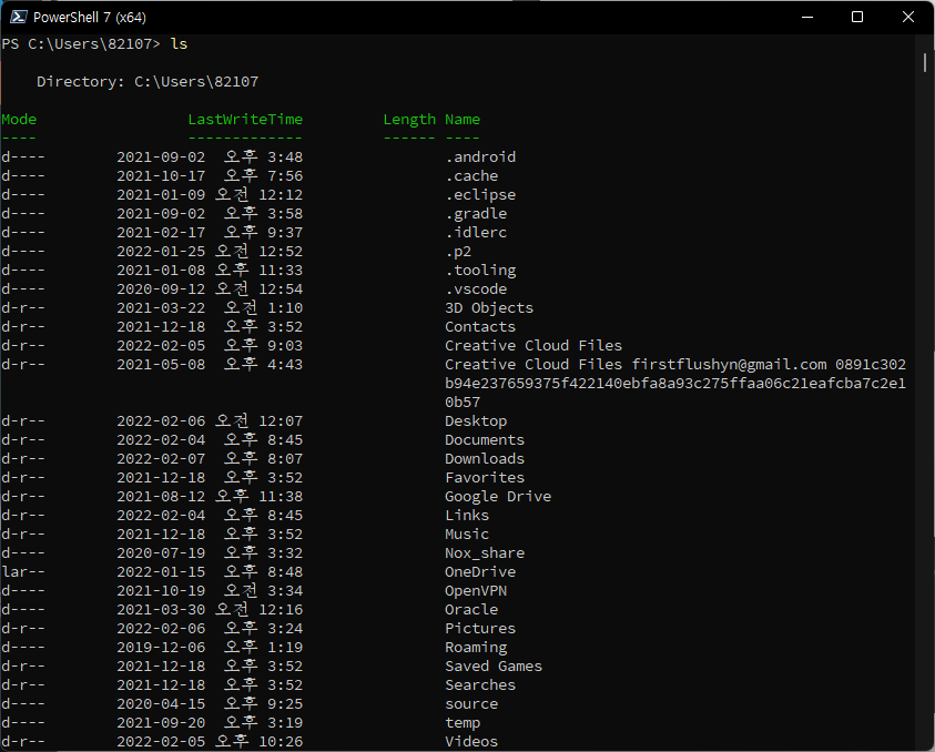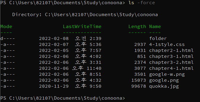 - ls -force : ์จ๊ฒจ์ง ํ์ผ, ๋๋ ํ ๋ฆฌ๊น์ง ์ถ๋ ฅ (Bash์์๋ ls -la ์ ๋ ฅ์ ์ด ๊ฒฐ๊ณผ๊ฐ ๋์ด)