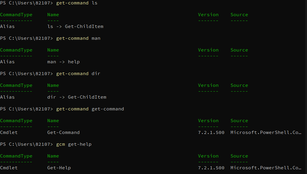 ๊ทผ๋ฐ cmdlet์๋ ์์์ ์ฌ์ฉํ๋ cd, ls, dir, man๋ ํฌํจ๋๋๋ฐ ์ด๋ ์ํค๋ฐฑ๊ณผ ํผ์ ๋ค๋ฅธ ์ด๋ฆ๊ฐ์ ๊ฒ์ด๋ผ๊ณ ํ๋ค. ๋น์ฅ get-command๋ฅผ gcm์ผ๋ก ์ค์ฌ๋ถ๋ฅด๋ ๊ฒ์ฒ๋ผ ๋ง์ด๋ค.
