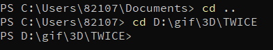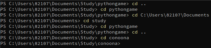 cd ...์ ์๋ค... - ํ์ฌ ๋ด ๊ฒฝ๋ก๊ฐ D:\gif\3D\TWICE ์ธ๋ฐ ์ฌ๊ธฐ์ C:\Users\82107\Documents\Study\conoona ๋ก ์ด๋ํ๊ณ ์ถ๋ค๋ฉด cd C:\Users\82107\Documents\Study\conoona ๋ก ์ ๋ ฅํ๋ฉด ๋๋ค. ์ฆ ์์ ์ฃผ์๋ฅผ ๋ค ์ ์ผ๋ฉด ๊ฑฐ๊ธฐ๋ก ์ด๋๋จ.