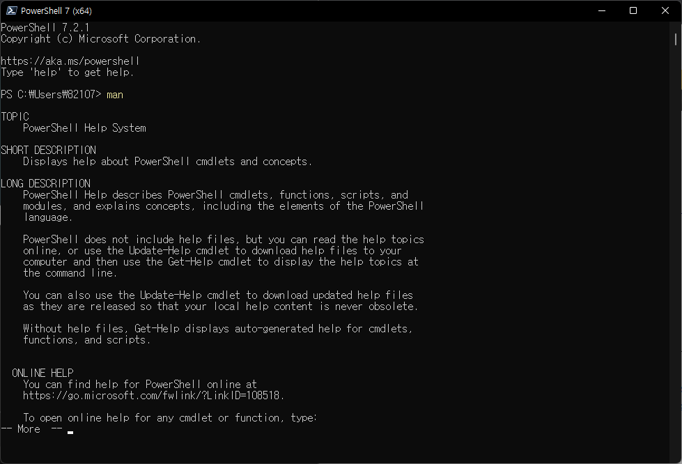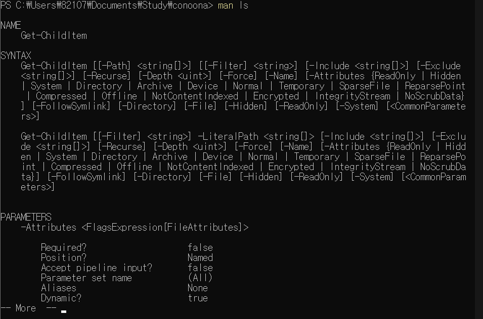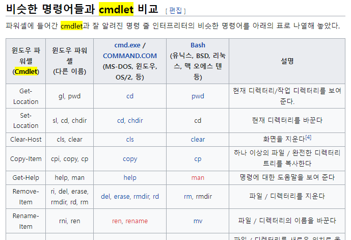Cmdlet์๋ Get-Help(๋ฑ ๊ท์น์ ๋ง์ถ ์ด๋ฆ)๋ผ๊ณ ์ ํ์๋๋ฐ๋ ๋ค๋ฅธ ์ด๋ฆ์๋ help, man๊ฐ ์๊ณ Remove-item์๋ cmd.exe์์ ์ฐ๋ ๊ฒ๋ง 4๊ฐ์ง๊ฐ ๋๋ค. (Cmdlet์์์ ์ข ๋ฅ๋ค์ธ๋ฏ.)