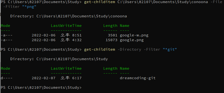 get-childitem (ํ์ผ ๊ฒฝ๋ก) -File ์ด๋ Directory -Filter ํ์ผ์ด๋ฆ (-Recurse)