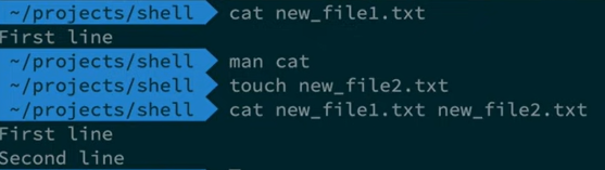 - cat ํ์ผ ์ด๋ฆ : catch์ ์ฝ์๋ก ํด๋น ํ์ผ์ ๋ด์ฉ ์ถ๋ ฅ, cat ํ์ผ ์ด๋ฆ ํ์ผ ์ด๋ฆ (+ํ์ผ ์ด๋ฆ ...) ๊ณผ ๊ฐ์ด ์์ฑํ ๊ฒฝ์ฐ ํด๋น ํ์ผ๋ค์ ๋ด์ฉ๋ค์ ์ค๋ฅธ์ชฝ ์บก์ณ์ ๊ฐ์ด ๋ชจ๋ ์ถ๋ ฅ