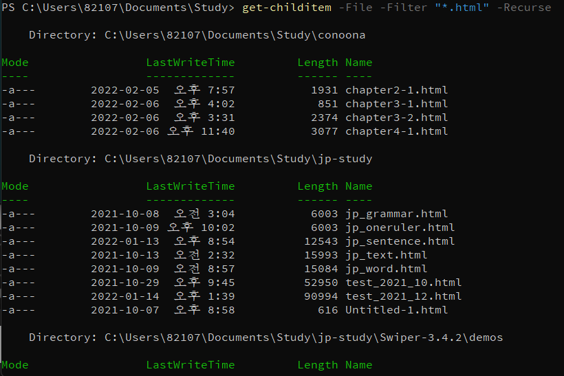 get-childitem (ํ์ผ ๊ฒฝ๋ก) -File ์ด๋ Directory -Filter ํ์ผ์ด๋ฆ (-Recurse)