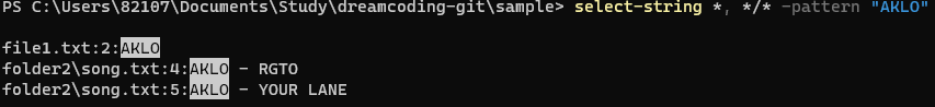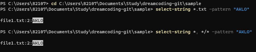 - select-string *, */* -pattern "๋ด์ฉ" : ํ๋จ๊ฒ ํ์ ํด๋๋ค๊น์ง ํ์)