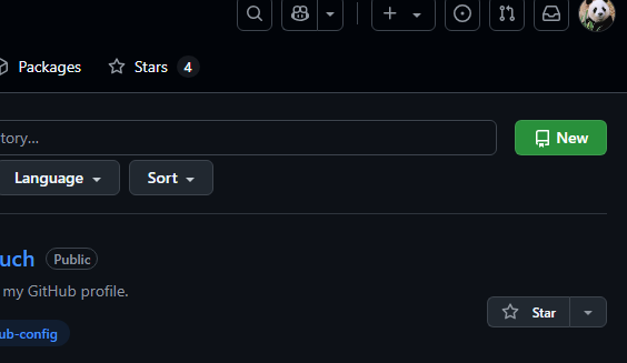 1. GitHub์ ๋ก๊ทธ์ธ → ์ฐ์ธก ์๋จ์ ๋ด ์์ด์ฝ์ ํด๋ฆญ → Your repositories ์ ํ → New ํด๋ฆญ(์ ๋ ํฌ์งํ ๋ฆฌ ์์ฑ)