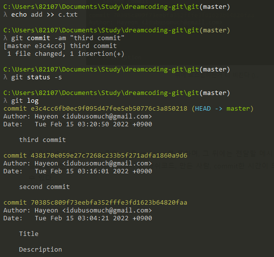 commit๋ค์ -a๋ -add๋ฅผ , -m์ message๋ฅผ ์๋ฏธํ๋ฉฐ ๋ด์ฉ์ "third commit".