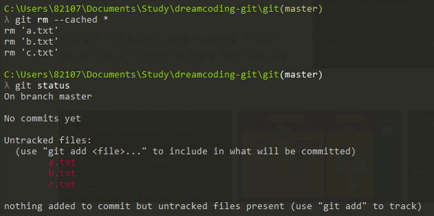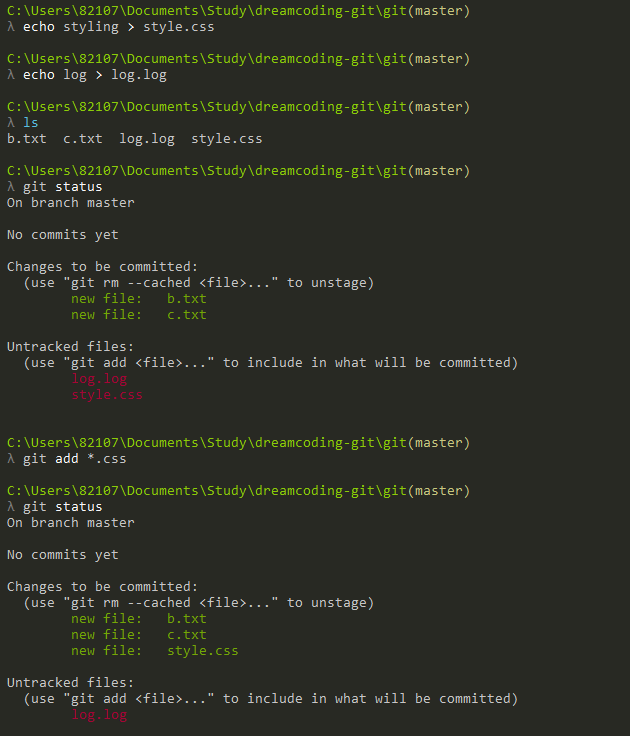 git add *.txt ๋ก ์์ฑํ๋ฉด txt ํ์ผ์ ๋ชจ๋ trackingํ ์ ์๋ค.