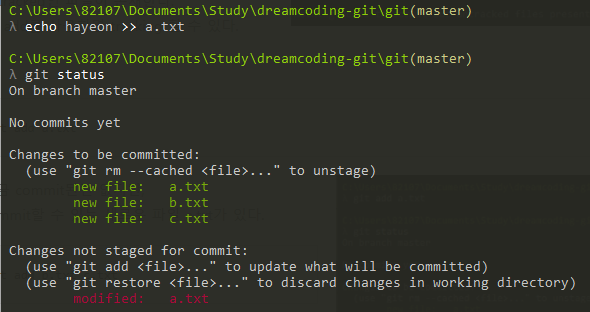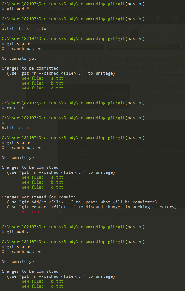 ์ฆ tracking์ ๋์ด ์์ง๋ง ์์ ์ ์ a.txt๊ฐ staging area์ ์๋ ๊ฒ์ด๋ฉฐ ์์ ํ์ a.txt๋ working directory์ tracked์ธ ์ฑ๋ก ๋จ์ ์๋ค. ๊ทธ๋ ๋ค๋ฉด ์ด ์์ ๋ a.txt๋ฅผ ๋ค์ trackingํ์ฌ staging area์ ์ฎ๊ธฐ๋ฉด ๋๋ค.