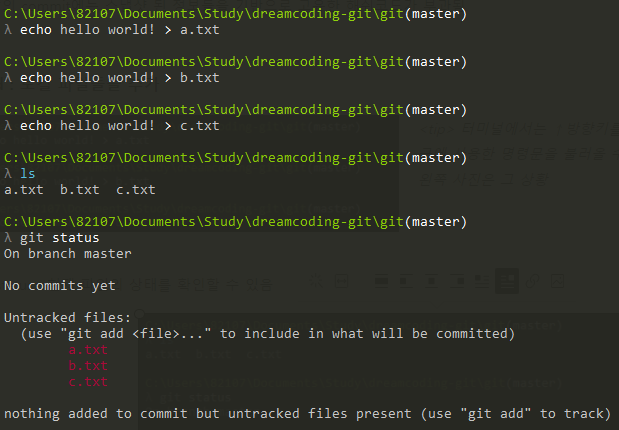 - git status : ํ์ฌ ํ์ผ์ ์ํ๋ฅผ ํ์ธํจ.