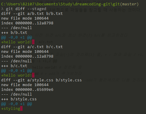 - git diff --staged : staging area์ ์๋ ํ์ผ๋ค์ ๋น๊ตํด๋ณด๊ณ ์ถ์ ๋ (staged๋ cached์ ๋์์ด๋ก ์ฐ์ด๋ฉฐ, git diff --cached ๋ผ๊ณ ์ฌ์ฉํด๋ ๋ฌด๋ฐฉํ๋ค.)