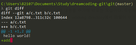 git diff ๋ค์ ์๋ฌด ์ต์ ๋ ๋ถ์ด์ง ์๋๋ค๋ฉด working directory์ ์๋ ๊ฒ๋ง ๋น๊ตํด์ ํ์ธํด ๋ณผ ์ ์๋ค.