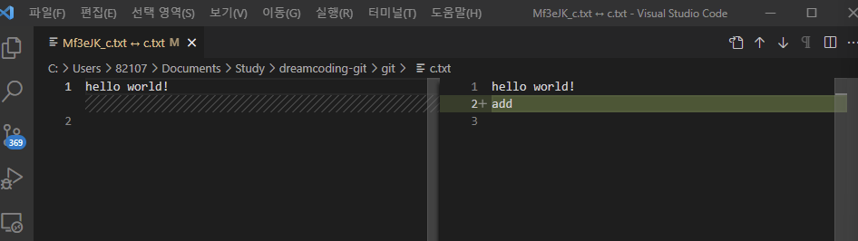 -0, 0 +1 : ์ด์ ํ์ผ์ ์์๊ธฐ์ 0, ์ด๋ ํ ์ค๋ ์๊ธฐ์ 0 ์ด์ง๋ง ์ ํ์ผ์๋ ์ฒซ ๋ฒ์งธ ์ค์ hello world!๊ฐ ์ถ๊ฐ ๋์๋ค.