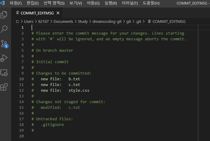 ์ ๊ณผ์ ์์์ commit ๋ค์ -m์ message๋ฅผ ๋ปํ๋ฉฐ, ๊ทธ ๋ค์๋ ์ ๋ฌํ ๋ฉ์์ง์ ๋ด์ฉ์ ์๋ฏธํ๋ค.