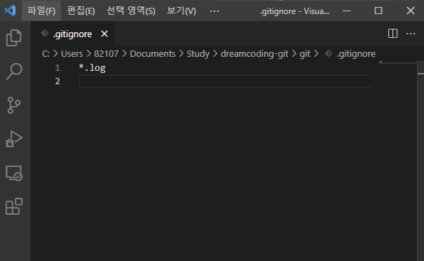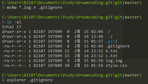 echo๋ก ignore ํ๊ณ ์ถ์ ํ์ผ์ ๋ฃ์ด๋์ผ๋ฉด, ์ค์ .gitignore ํ์ผ์ ํด๋น ํ์ผ(์ฌ๊ธฐ์ log ํ์ผ ํ์์ ..)์ด ๋ค์ด๊ฐ์๋ ๊ฒ์ ๋ณผ ์ ์๋ค. ๊ทธ๋ฆฌ๊ณ git์ ์ํ๋ฅผ ํ์ธํด๋ณด๋ฉด .gitignore ํ์ผ์ ํธ๋ํน๋์ง ์์์ง๋ง .log ํ์ผ์ด ์์ ์ฌ๋ผ์ง ๊ฒ์ ๋ณผ ์ ์๋ค! (์ญ์ ๋ ๊ฒ์ ์๋๋ค. ๊ทธ๋ฅ ๋ฌด์๋นํ์ ๋ฟ)