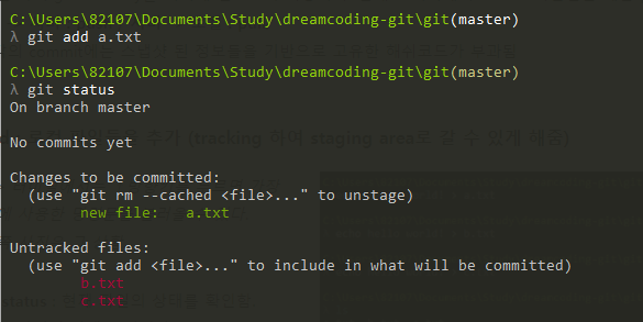 - ์์์ ์ด๋ฏธ ํธ๋ํนํ b.txt์ c.txt๋ commit๋ ์ค๋น๊ฐ ๋์ด ์์