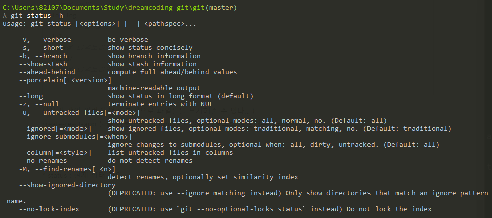 ์ฌ๊ธฐ์ --long์ (default)๊ฐ ํ์๋์ด์๋๋ฐ, ๊ทธ๋ฅ git status๋ผ๊ณ ์ ๋ ฅํ๋ฉด ๋ํดํธ, ์ฆ ๊ธฐ๋ณธ์ ์ผ๋ก ์ ์ฉ์ด ๋๋ค๋ ๋ป์ด๋ค.