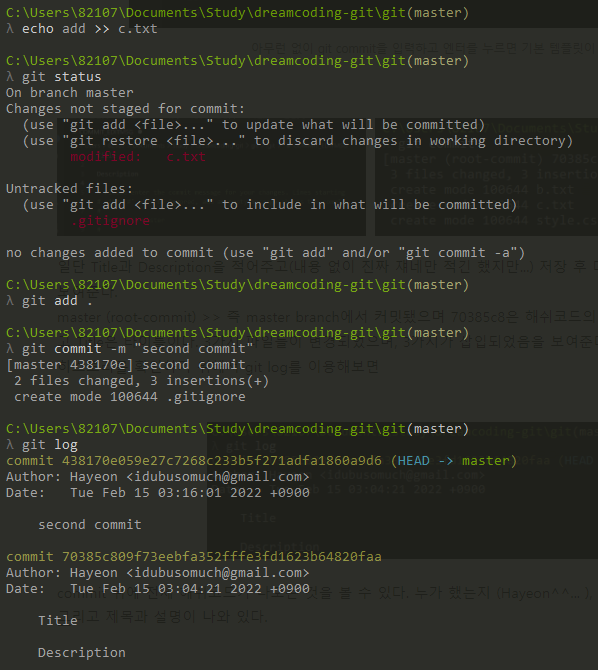 ์ง๊ธ์ ์ฒ์ ์ปค๋ฐ์ด๋ ํ์คํ ๋ฆฌ๊ฐ ์ ๊ฑฐ ํ๋ ๋๋ ~ ์์ง๋ง ์ฒ์์ด ์๋ ํ์ผ์ผ ๋ ํ์คํ ๋ฆฌ๊ฐ ์ด๋ป๊ฒ ๋์ค๋์ง ๋ณด๊ณ ์ถ์ผ๋๊น ๋ง๋งํ c.txt์ 'add'๋ฅผ ์ถ๊ฐํด๋ณด์.