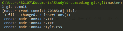 master (root-commit) >> ์ฆ master branch์์ ์ปค๋ฐ๋์ผ๋ฉฐ 70385c8์ ํด์ฌ์ฝ๋์ ๋งจ ์ ๋ถ๋ถ๋ง ๋ฐ์ ๋ณด์ฌ์ค๋ค. ๊ทธ๋ฆฌ๊ณ Title์ ํ์ดํ์ด๋ค. 3๊ฐ์ง ํ์ผ๋ค์ด ๋ณ๊ฒฝ๋์์ผ๋ฉฐ, 3๊ฐ์ง๊ฐ ์ฝ์ ๋์์์ ๋ณด์ฌ์ค๋ค.