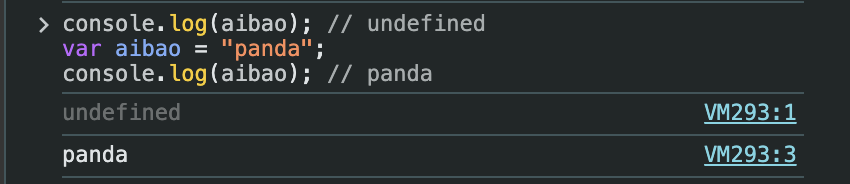 var aibao="panda";๊ฐ ํธ์ด์คํ ๋์ด aibao๊ฐ ๋ณ์ ๊ฐ์ฒด์ ๋ฑ๋ก๋๊ณ ๊ฐ์ undefined๋ก ์ด๊ธฐํ๋๋ค.