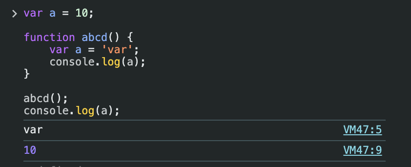 function ๋ด์์๋ a๊ฐ ์ ์ธ๋์์ผ๋ ๊ทธ๋๋ง ํจ์ ๋ด์์๋ง var a = 'var'๋ก ํ ๋นํ ์ง์ญ๋ณ์์ธ a์ด๊ธฐ ๋๋ฌธ์,
