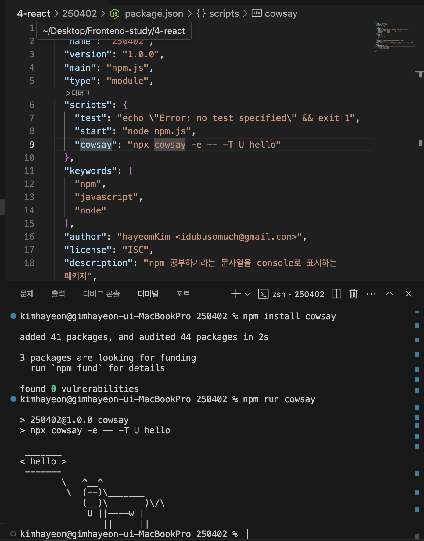2-1. package.json์ scripts์ ํน์ ๊ตฌ๋ฌธ์ cowsay๋ผ๋ ๋ช ๋ น์ด๋ก ์ถ๊ฐํ ์คํ