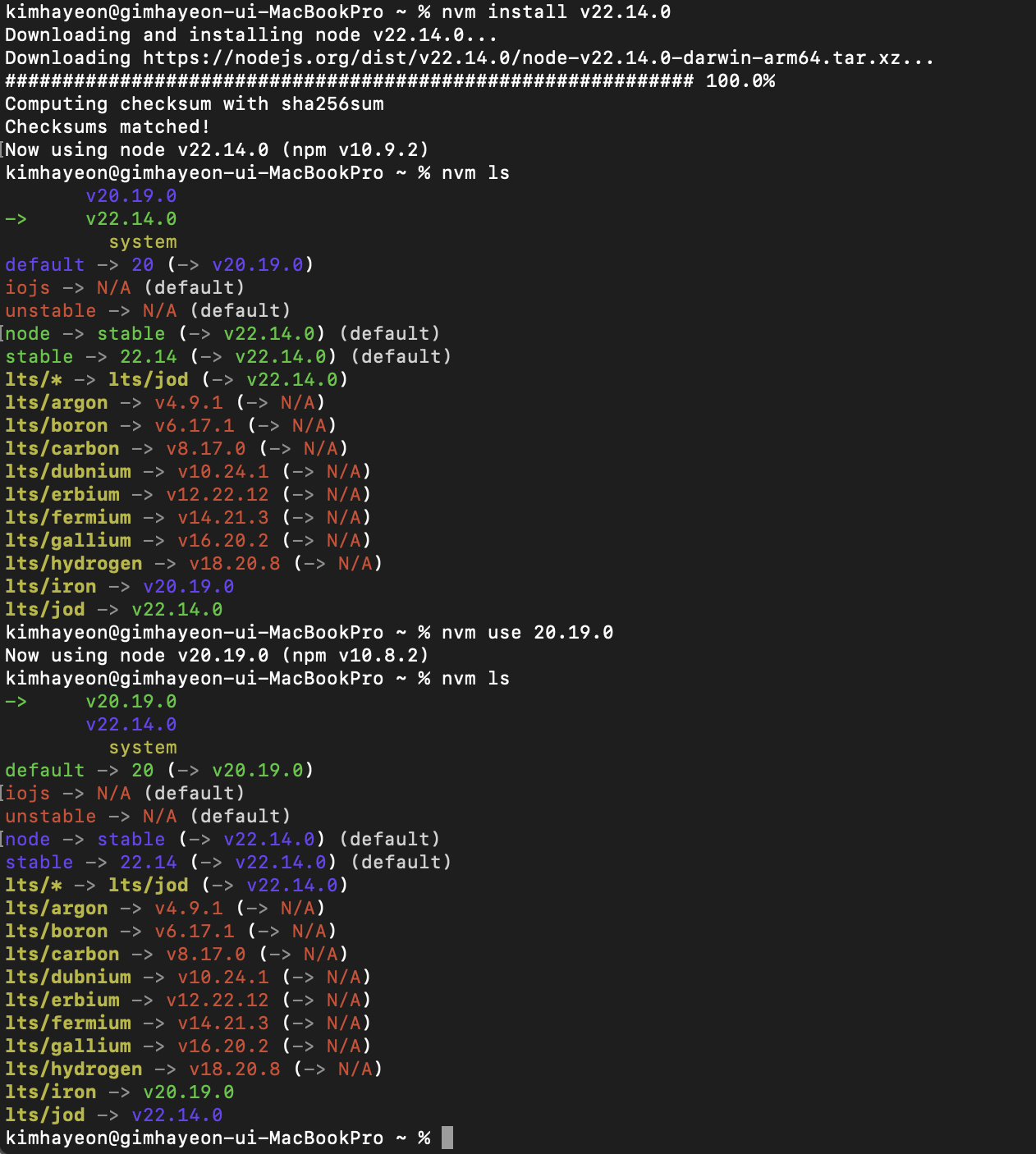 ์ด ๋ ๋ค๋ฅธ ๋ฒ์ ์ ์ฌ์ฉํ๊ณ ์ถ๋ค! ํ๋ฉด ์์์ ์ค์นํ ๊ฒ ์ฒ๋ผ nvm install ๋ฒ์ ๋ช ์ ์ฌ์ฉํ๋ฉด ๋๋ค.