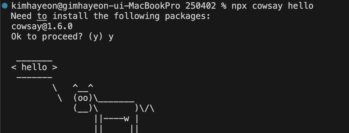 npx -y cowsay "hello"๋ -y๋ฅผ --yes๋ก ๋ณ๊ฒฝํด ์์ฑํ๋ฉด ์๋์ผ๋ก ์น์ธ๋ผ์ ์์ ๊ฐ์ ํ๋กฌํํธ๋ ๋จ์ง ์๋๋ค๊ณ ํ๋ค.