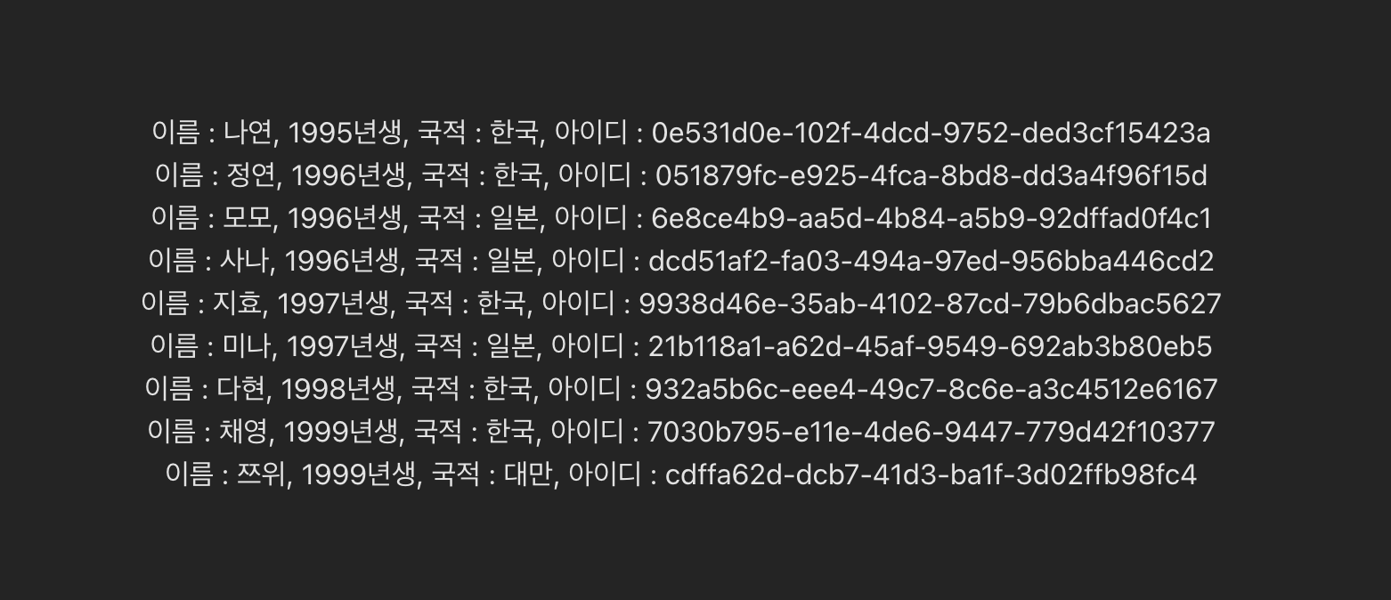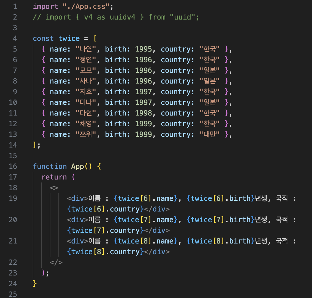 { id: uuidv4(), name: "๋คํ", birth: 1998, country: "ํ๊ตญ" },