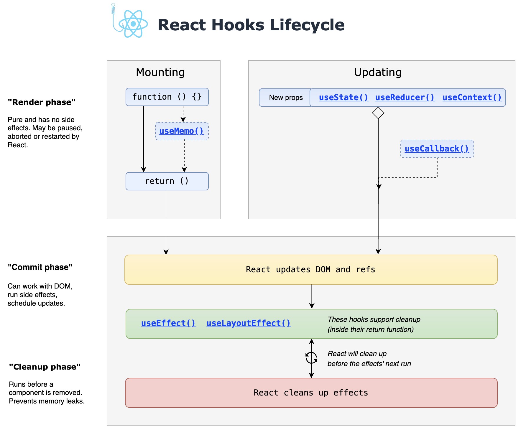 ์ด ๋ ํด๋์คํ๊ณผ ๋ฌ๋ฆฌ ํจ์ํ ์ปดํฌ๋ํธ๋ ์ธ์คํด์ค๋ฅผ ๋ง๋ค๊ณ , ๋ง์ดํธ๋์ ๋ ์ํ ๋ณ๊ฒฝ์ด ์ผ์ด๋ ๊ฒฝ์ฐ ๋ด๋ถ๋ฅผ ๋ณ๊ฒฝํ๋ ํด๋์ค์ ๋ฌ๋ฆฌ ์์ ํธ์ถํ๋ ํจ์๋ฅผ ๋ ์ด์ ์ฌ์ฉํ์ง ์๊ณ , ์๋ก์ด ์ํ ๊ฐ์ผ๋ก ํจ์๋ฅผ ํธ์ถํ๋ค. ๊ธฐ์กด ํจ์๋ ์ฌ๋ผ์ง๊ณ ์๋ก์ด ํจ์ ํธ์ถ๋ก ๋์ฒด๋๋ฉฐ ๋ฆฌ๋ ๋๋ง๋๋ค.