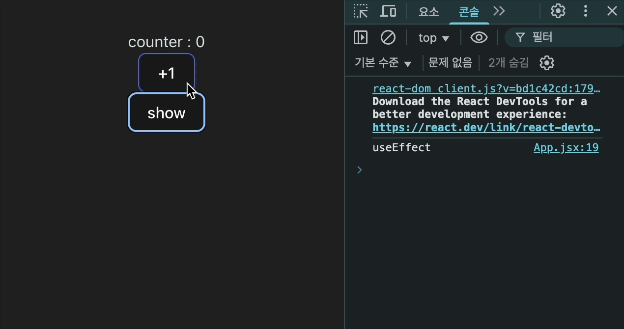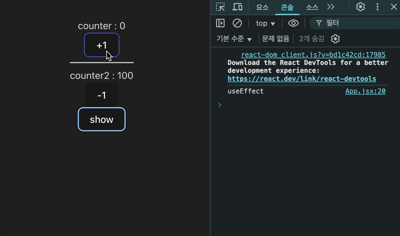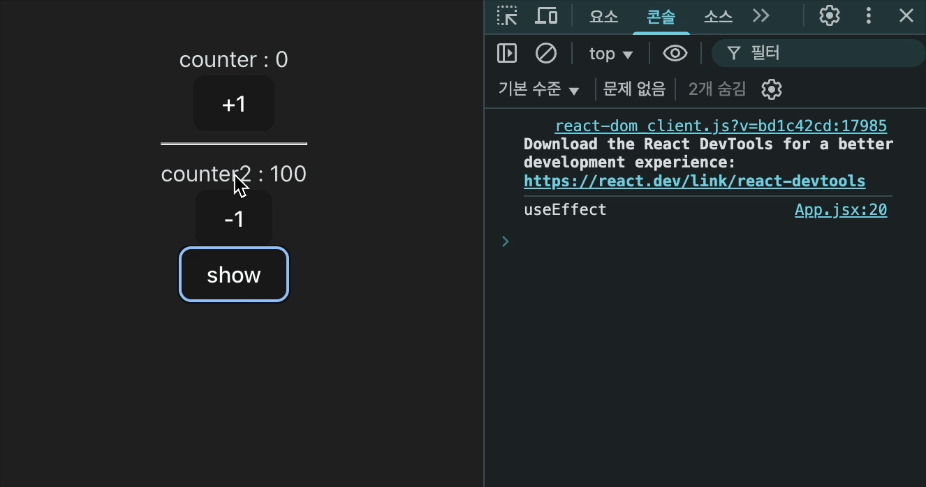 ๋ง์ดํธ๋ ๋์, ์ธ์๋ก ๋ฃ์ counter2์ ์ํ๊ฐ ๋ณ๊ฒฝ๋ ๋๋ง (์ ๋ฐ์ดํธํ ๋๋ง) useEffect๊ฐ ์คํ๋๋ ๊ฒ์ ๋ณผ ์ ์๋ค.
