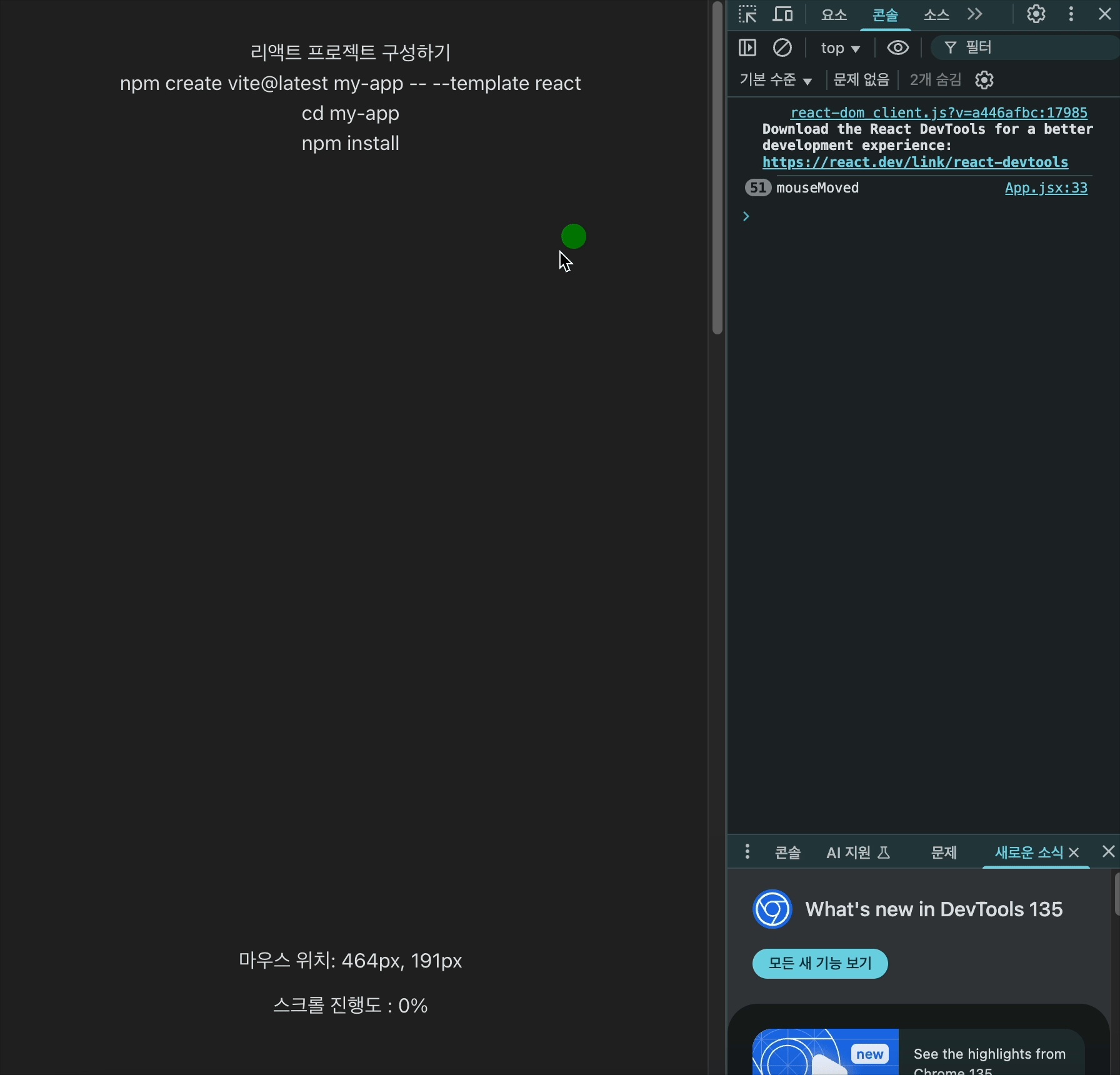 // ์ปดํฌ๋ํธ๊ฐ ๋ ๋๋ง๋ ๋๋ง๋ค (์ํ๊ฐ ๋ณ๊ฒฝ๋ ๋๋ง๋ค) handleMouseMove๋ฅผ ๋ฑ๋ก