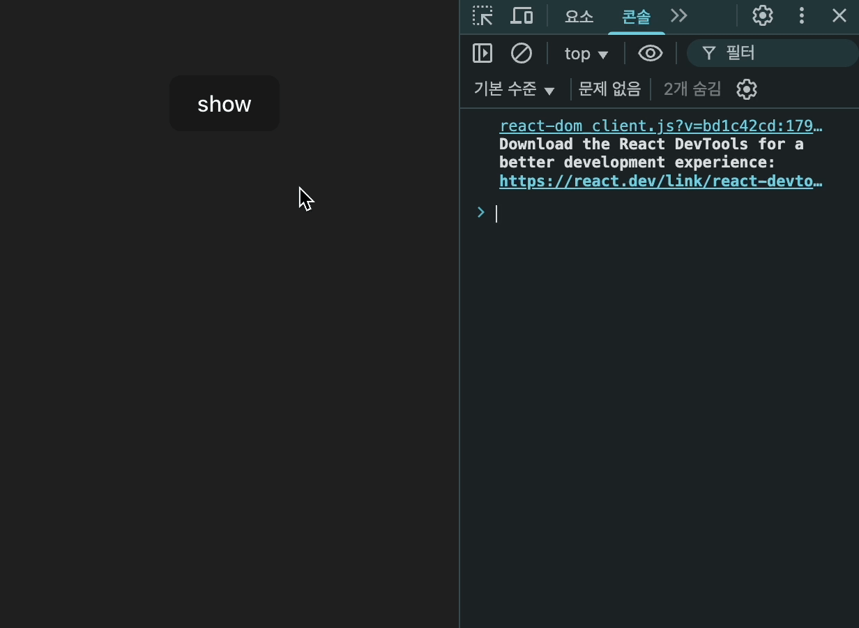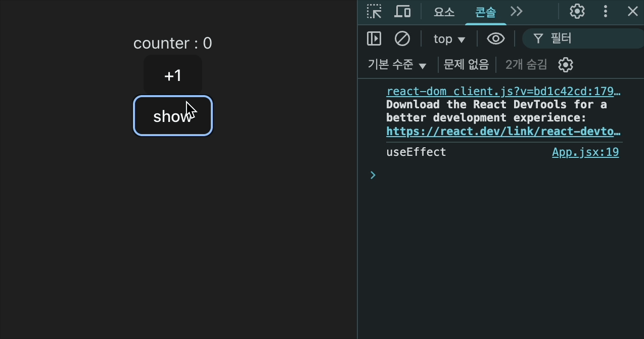 (์ด๋ ํด๋ฆฌ๋ ํจ์๋ก ์ด์ ์ด๋ฒคํธ๋ฅผ ๋ฐ๋ก๋ฐ๋ก ์ ๊ฑฐํด์ฃผ์ง ์์ผ๋ฉด ์ด๋ฒคํธ ๋ฆฌ์ค๋๊ฐ ์์ฌ์ ์ฝ์์ฐฝ์ผ๋ก useEffect์ ์คํ ํ์๊ฐ ๊ธฐํ๊ธ์์ ์ผ๋ก ๋์ด๋๋ ๊ฑธ ๋ณผ ์ ์๋ค... )