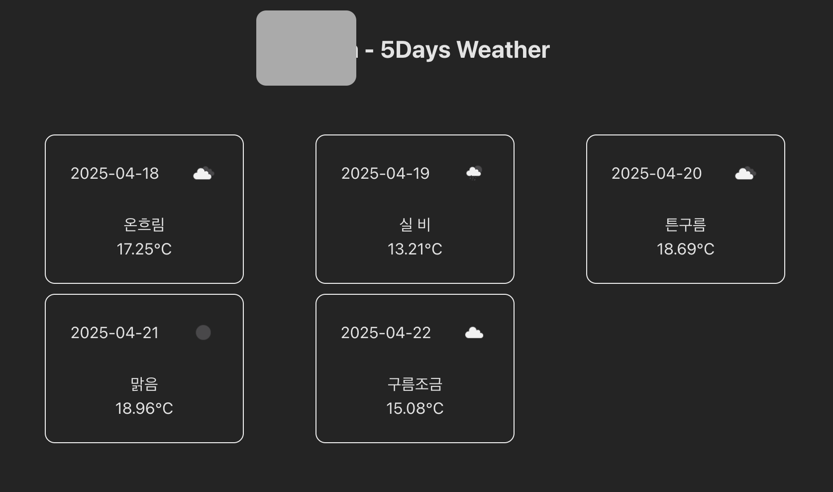 ์ด์ ๋ openweathermap API๋ก ํ์ฌ ๋ด ์์น์ 5์ผ๊ฐ์ ๋ ์จ๋ฅผ ๋ฐ์์ค๊ณ ,