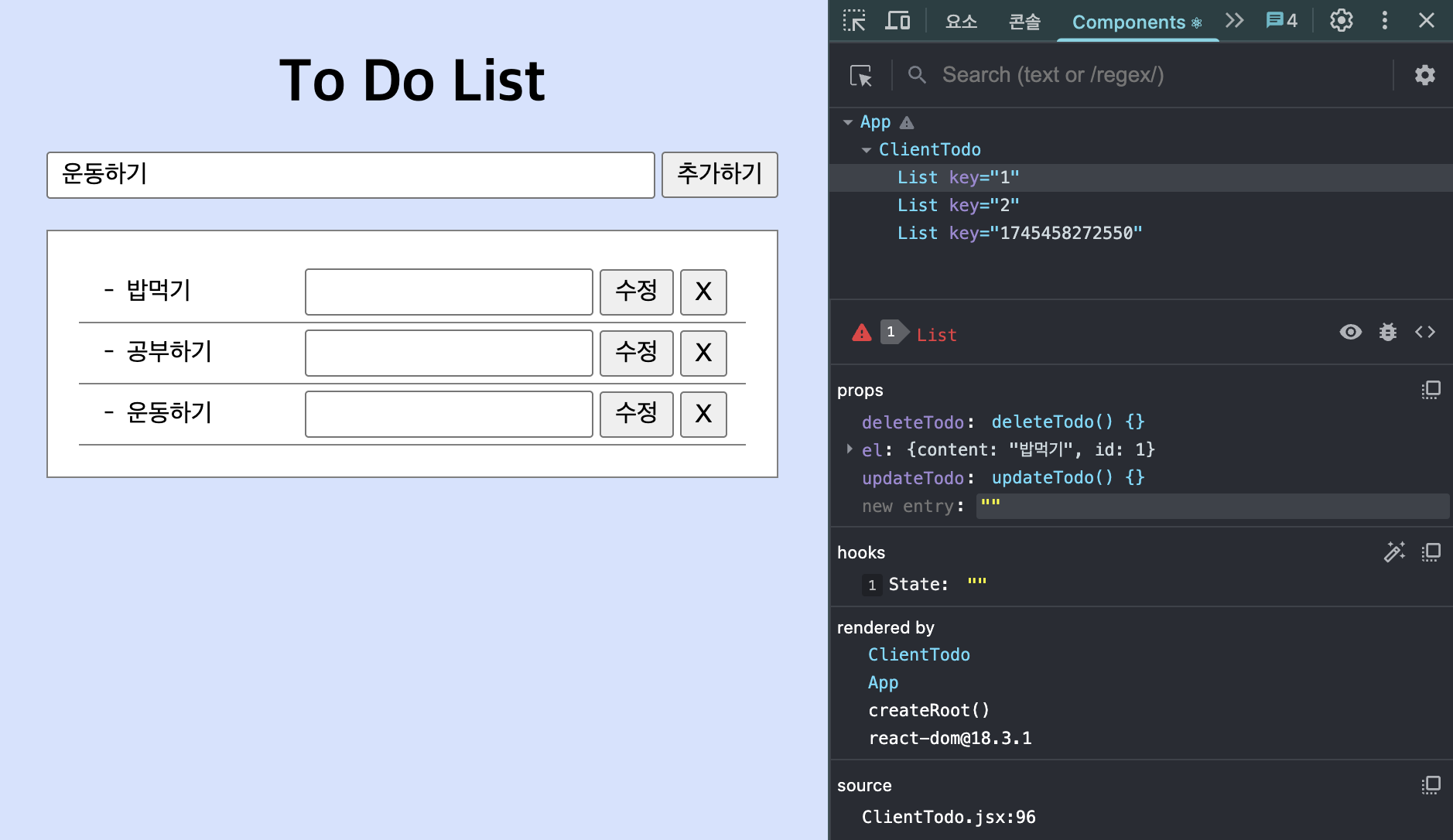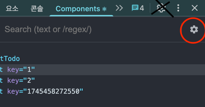 ์์์ ๋ฆฌ์กํธ ํ๋ก์ ํธ๋ฅผ ์คํ์์ผฐ์ ๋, ๊ฐ๋ฐ์ ๋๊ตฌ์ Components ํญ์์ ํ์ธํ ์ ์๋ค.