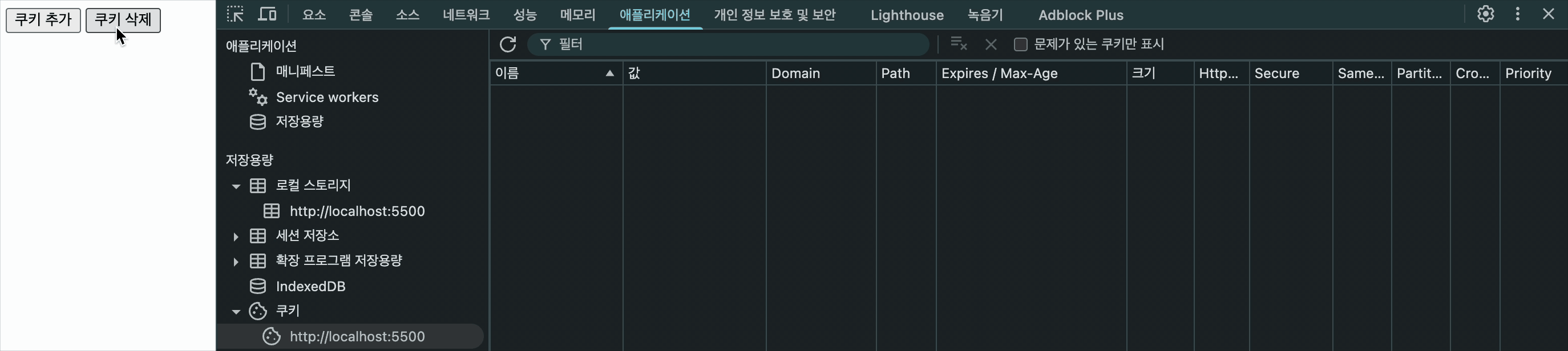 ํ์ฌ ๊ฐ ์ธ์ ์ ์๋ฌด ์ค์ ๋ ํ์ง ์์ ์๋์ผ๋ก ๋ค์ด์จ ๊ฐ์ธ๋ฐ, ์ด๋ ๋ธ๋ผ์ฐ์ ๋ฅผ ๋ซ์ผ๋ฉด ์ฟ ํค๊ฐ ๋ฐ๋ก ๋ ์๊ฐ๊ฒ ๋๋ค. - HttpOnly : ์ฟ ํค๋ฅผ JavaScript (document.cookie)๋ก ์ ๊ทผํ ์ ์๊ฒ ๋ง๋ ๋ณด์ ์ต์