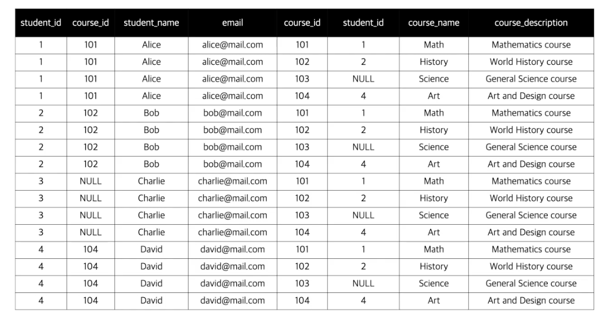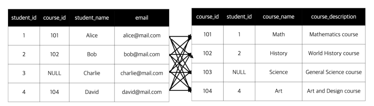 PK, FK 연결과 관계 없이 두 테이블의 가능한 모든 집합 (곱집합)