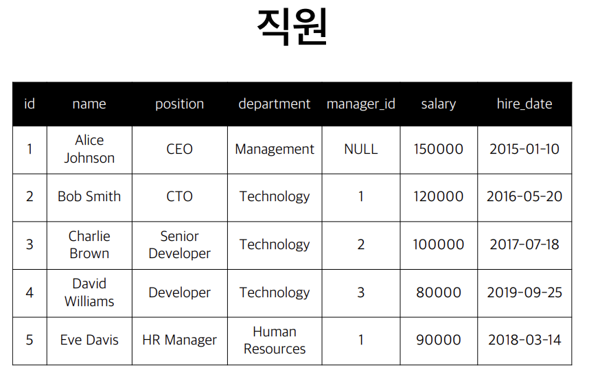 이 매니저의 이름을 알고 싶다면 manager_id가 가리키는 다른 직원의 name을 찾아야함