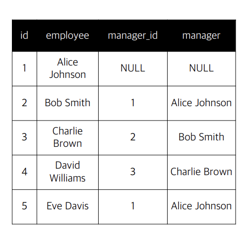 다음과 같이 직원이라는 테이블이 있다. id가 pk고, manager_id는 해당 직원의 manager의 Id를 참조 (Pk를 참조)하고 있다.