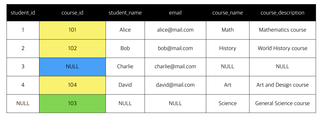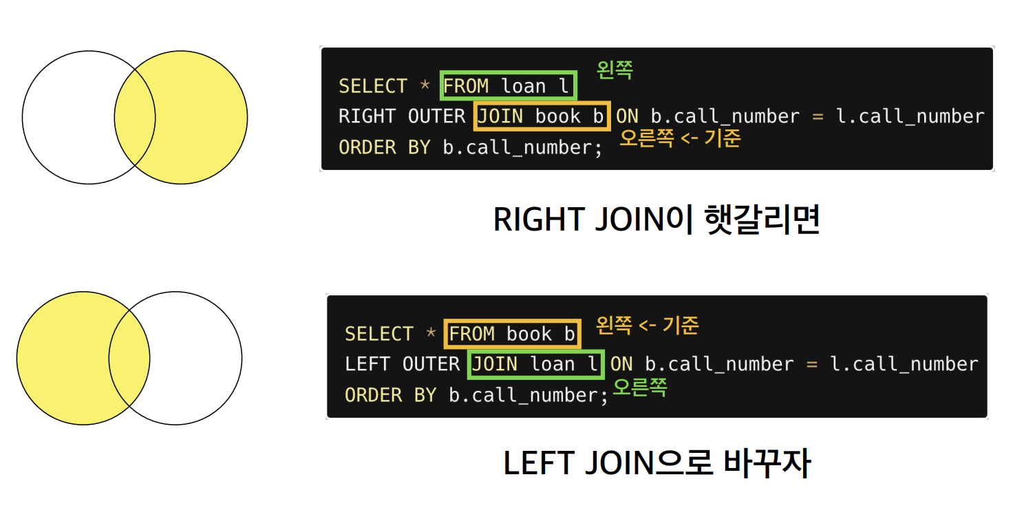right join이 헷갈리면 그냥 무조건 주축이 되는 테이블을 왼쪽으로 두고 left outer join만 하면 된다...