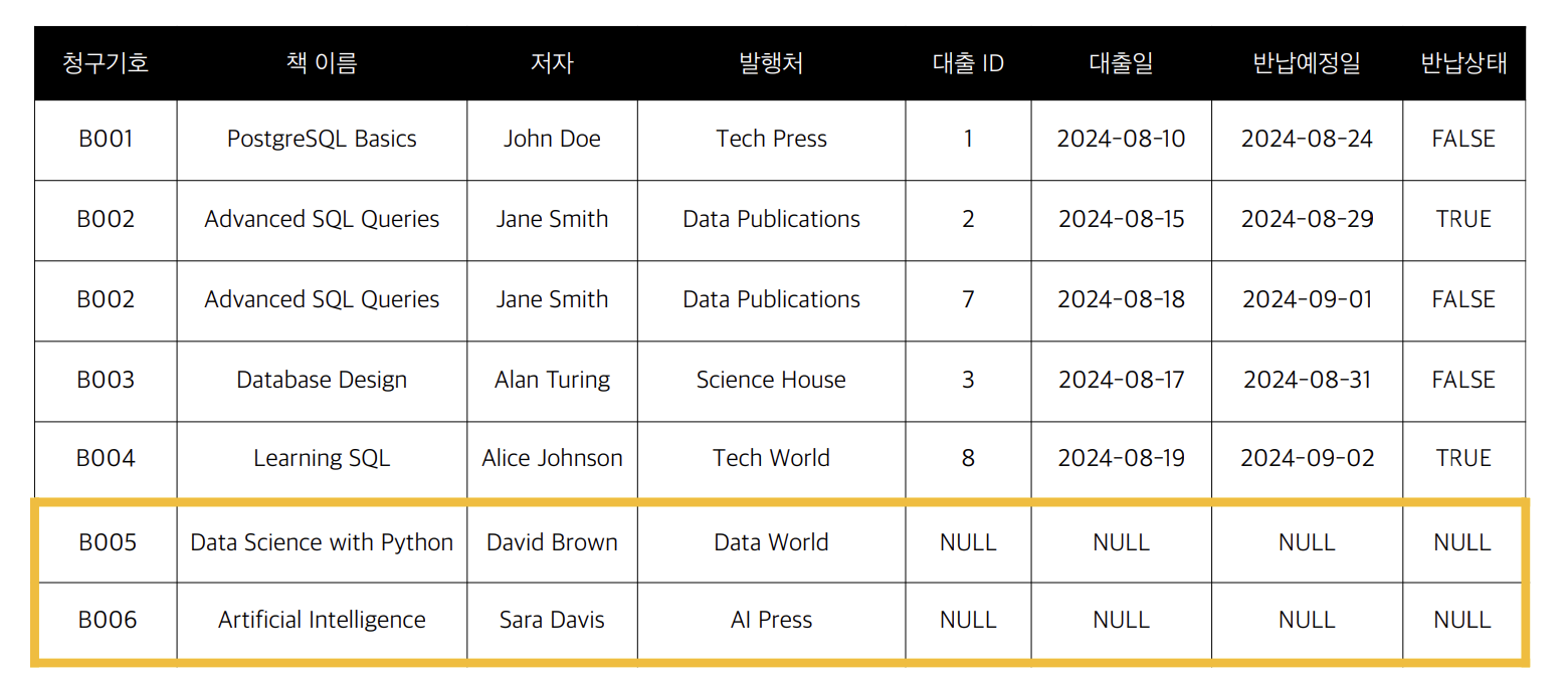왼쪽 테이블을 기준으로 로우를 조인. left outer join이라고도 한다.