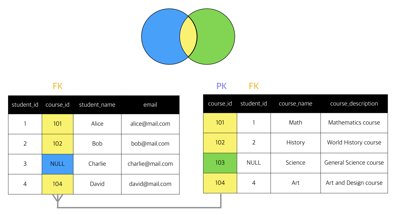 inner join에서는 A의 pk와 B의 fk의 교집합 부분이 선택됐다면,