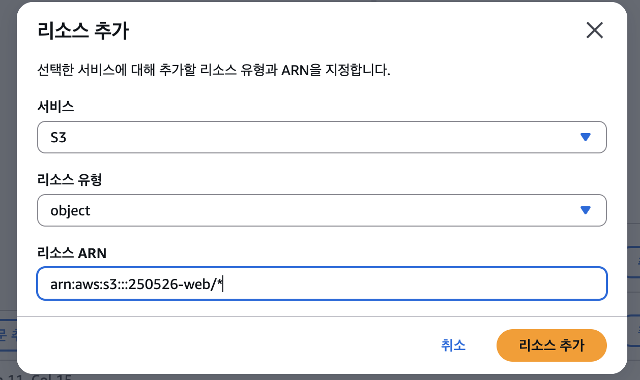 ์์ ์ถ๊ฐ ๋ฐ๋ก ์๋์ ์๋ ๋ฆฌ์์ค ์ถ๊ฐ ํด๋ฆญ ํ ๋ฆฌ์์ค ์ ํ์ object๋ก ์ ํํ๋ฉด ๋ฆฌ์์ค ARN ๊ฐ์ด ์ฒซ๋ฒ์งธ ์ด๋ฏธ์ง์ฒ๋ผ ๋์ค๊ฒ ๋๋ค.