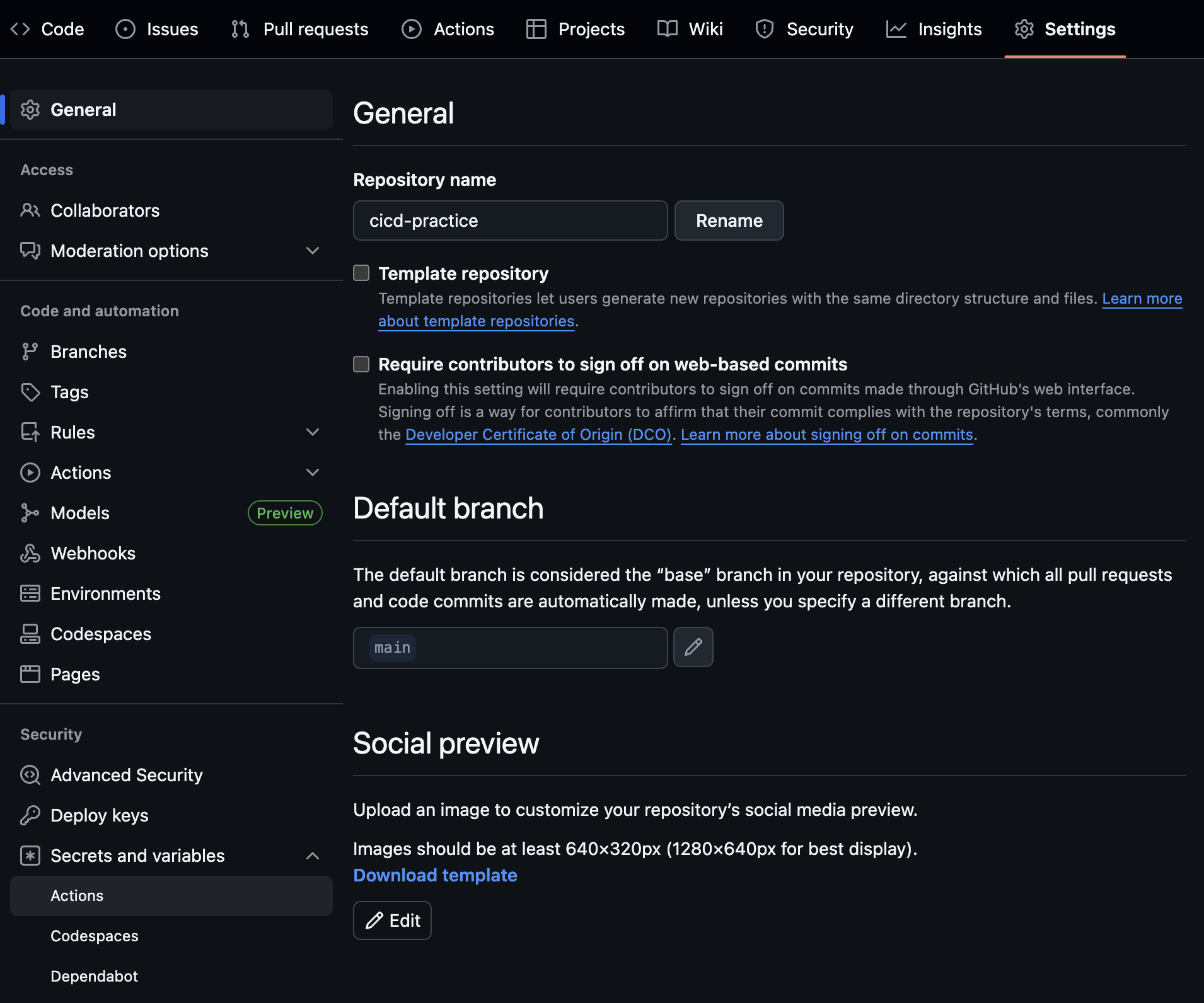 ๋ณ์๋ฅผ ์ง์ ํด์ฃผ๋ ค๋ฉด ๋ ํฌ์งํ ๋ฆฌ์ Settings ํญ์ ๋ค์ด๊ฐ Secrets and variables - Actions์ผ๋ก ๋ค์ด๊ฐ๋ค.