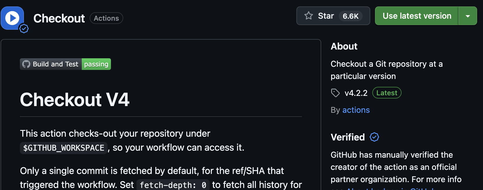 ๊ธฐ๋ณธ ์ฌ์ฉ๋ฐฉ๋ฒ์ step์ -uses: action/checkout@v4 ๋ฅผ ์ถ๊ฐํ๊ธฐ.