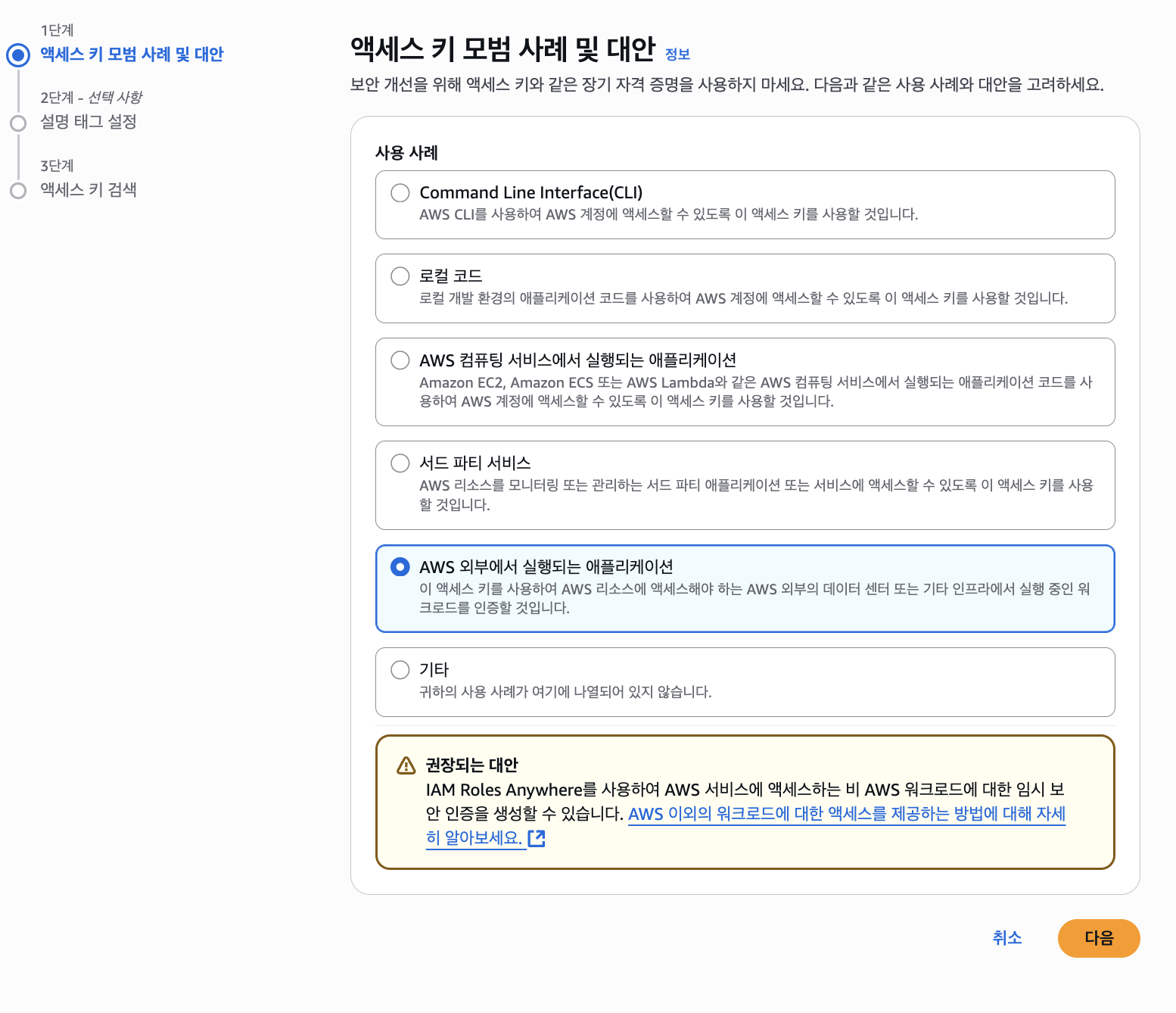 ์ผ๋จ github actions ์์ฒด๋ aws์ ์ธ๋ถ ์๋น์ค์ด๊ธฐ ๋๋ฌธ์ ๋ฐ๋ก ์ก์ธ์คํค๋ฅผ ๋ฐ๊ธ๋ฐ์์ผ ํ๋ค.