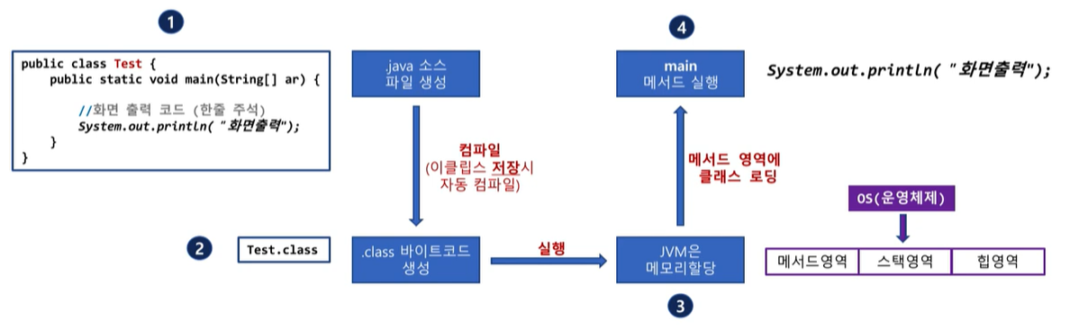 μμ€ νμΌ(.java)μ μμ±ν ν μ»΄νμΌμ μννλ©΄ (μ΄ν΄λ¦½μ€ μ¬μ© μ μμ€μ½λλ₯Ό μ μ₯νλ©΄ μλμΌλ‘ μ»΄νμΌμ ν΄μ€λ€.) JVMμμ λμνλ λ°μ΄νΈ μ½λ(.class)κ° μμ±λλ€. μ΄ λ μμ€ νμΌκ³Ό λ°μ΄νΈ μ½λλ κ°κ° νλ‘μ νΈ λ΄μ src ν΄λμ bin ν΄λ μμ μμΉνλ€. μ΄ν λ°μ΄νΈ μ½λλ₯Ό μ€ννλ©΄ JVMμ OSμμ λ©λͺ¨λ¦¬λ₯Ό ν λΉλ°μ μλ° νλ‘κ·Έλ¨μ μ€ννλ€.