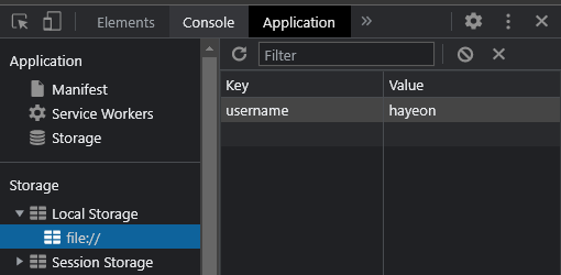 local storage์๋ ์ค๋ฅธ์ชฝ ์บก์ณ์ ๊ฐ์ด key, value ํ์์ผ๋ก ์ ์ฅ๋๋ค.